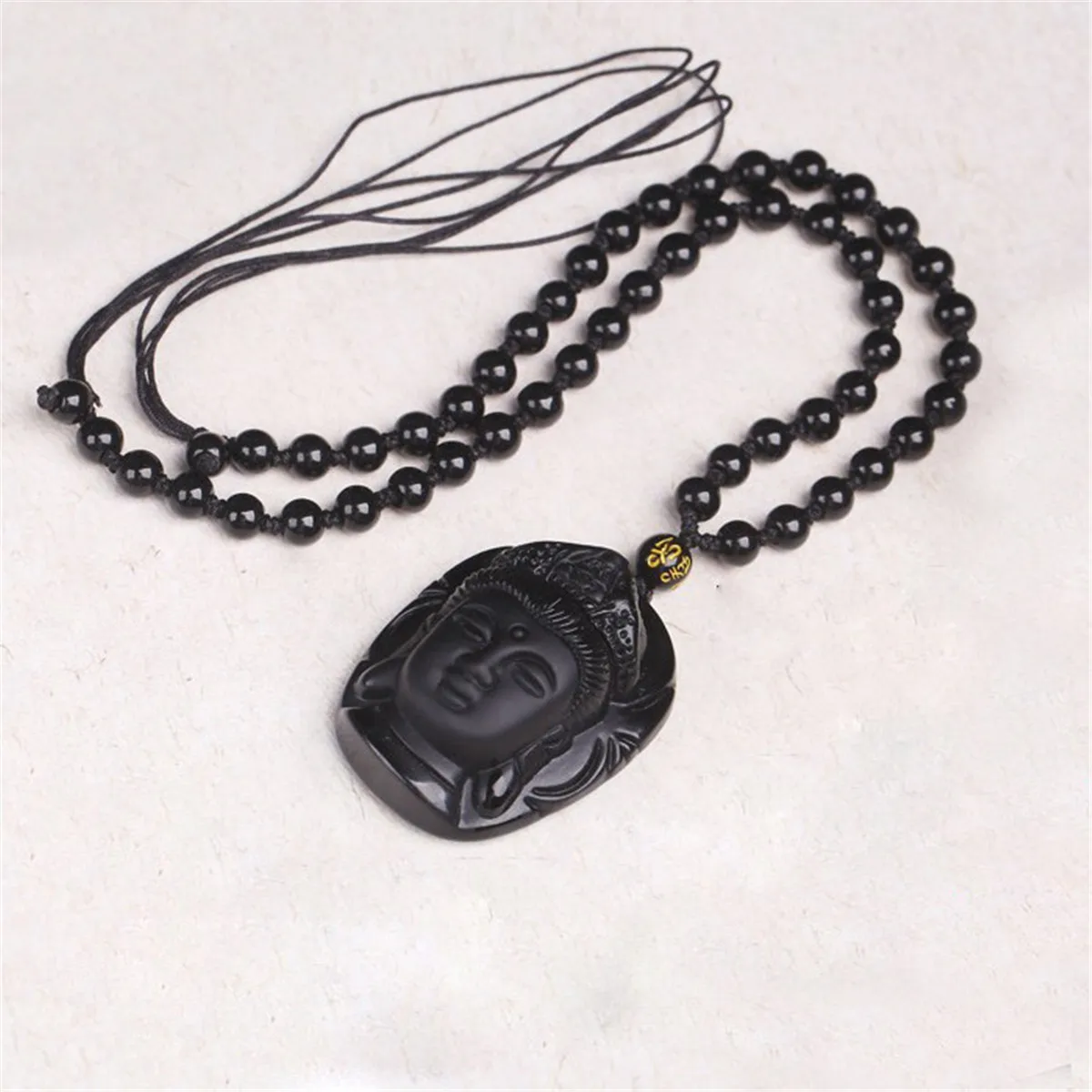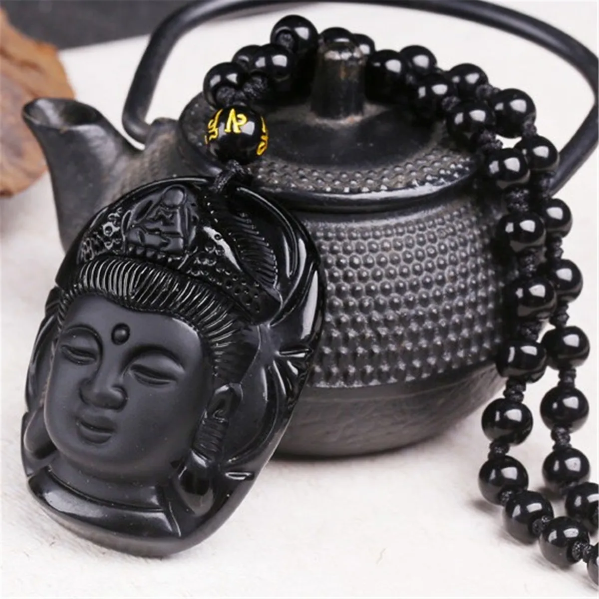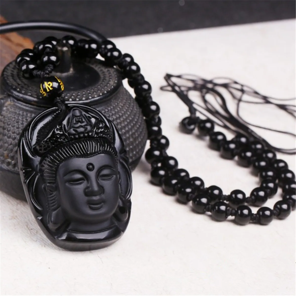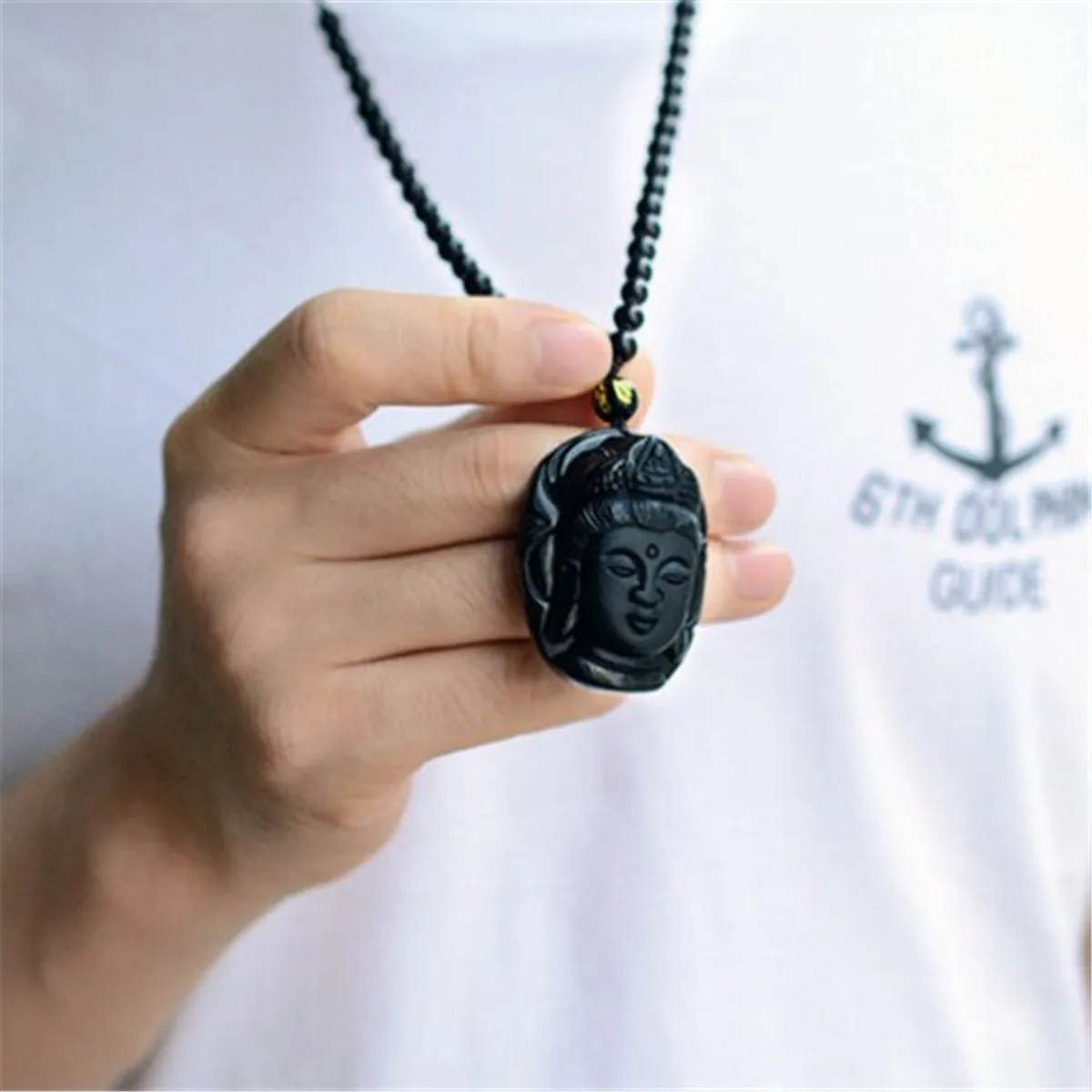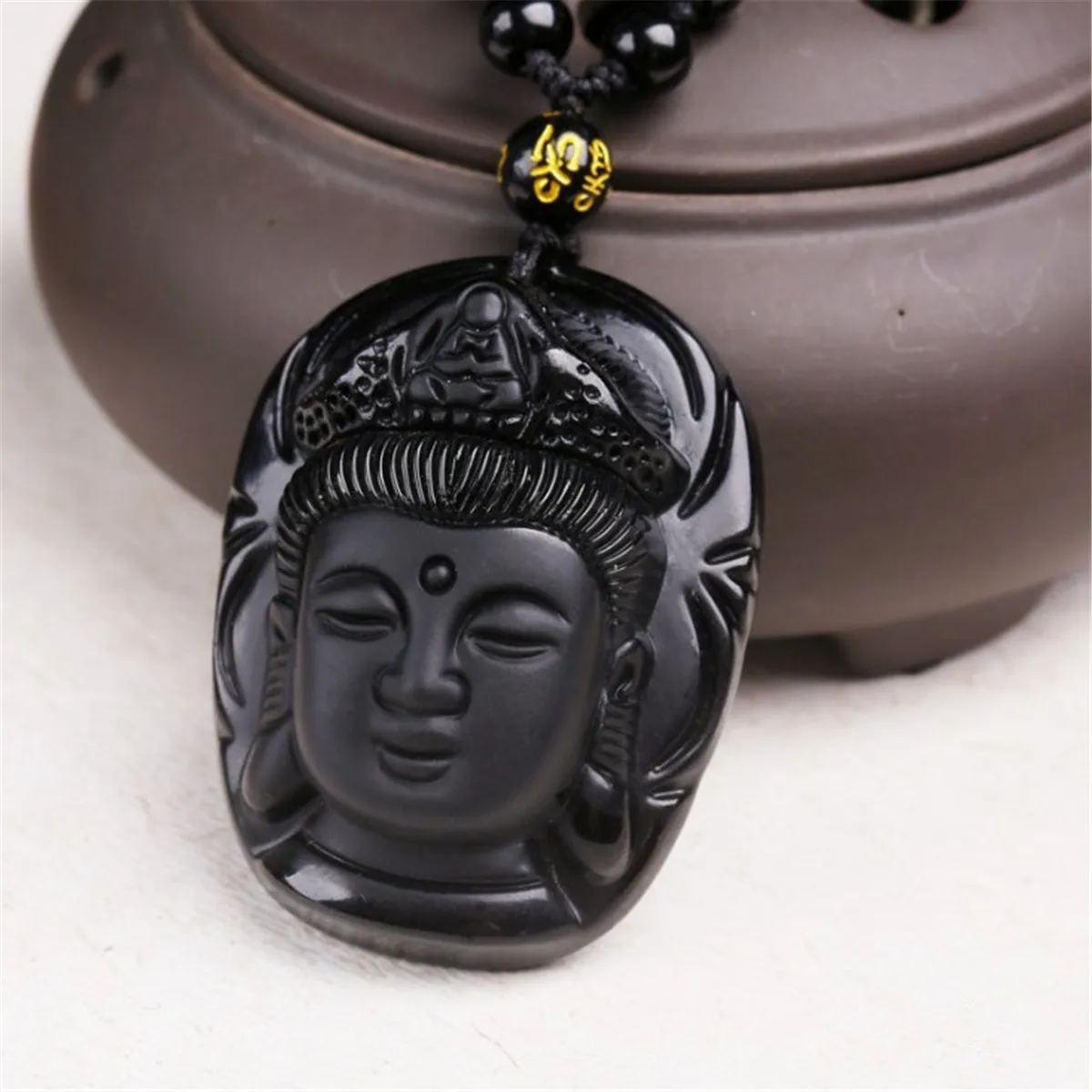 Description: This hand carved pendant is made from obsidian. Black Obsidian Stone is a powerful cleanser of psychic smog created within your aura, and is a strong psychic protection stone that will shield you against negativity and stress Buddha(Guan Yin): It is believed in many esoteric cultures that wearing the image of the Buddha around your neck attracts positive energy from the supreme being. The Goddess Kwan Yin is known as the Goddess of Mercy and her specialty is compassion.