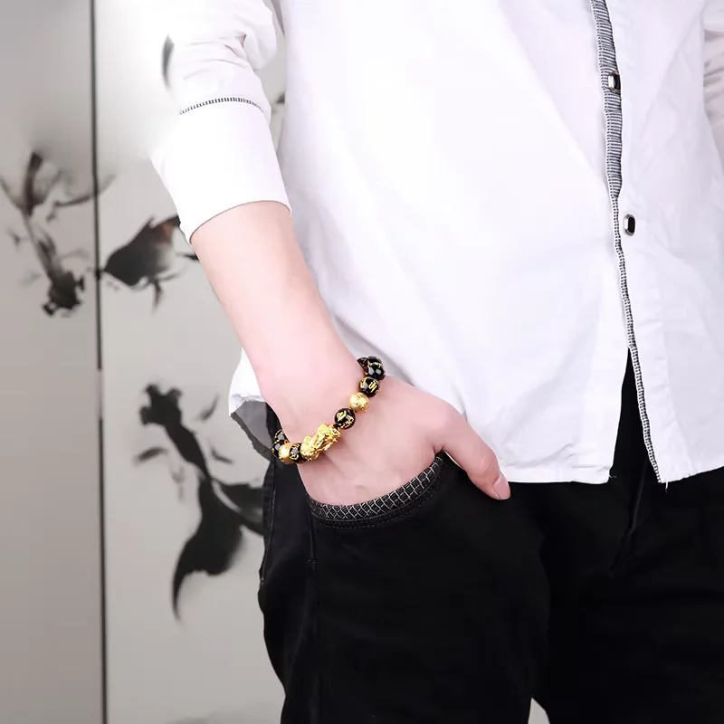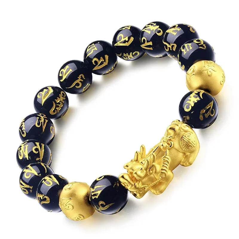 新款好运财富黑色黑曜石珠子手链风水盛世护身符男士六字皮秀手链镀金