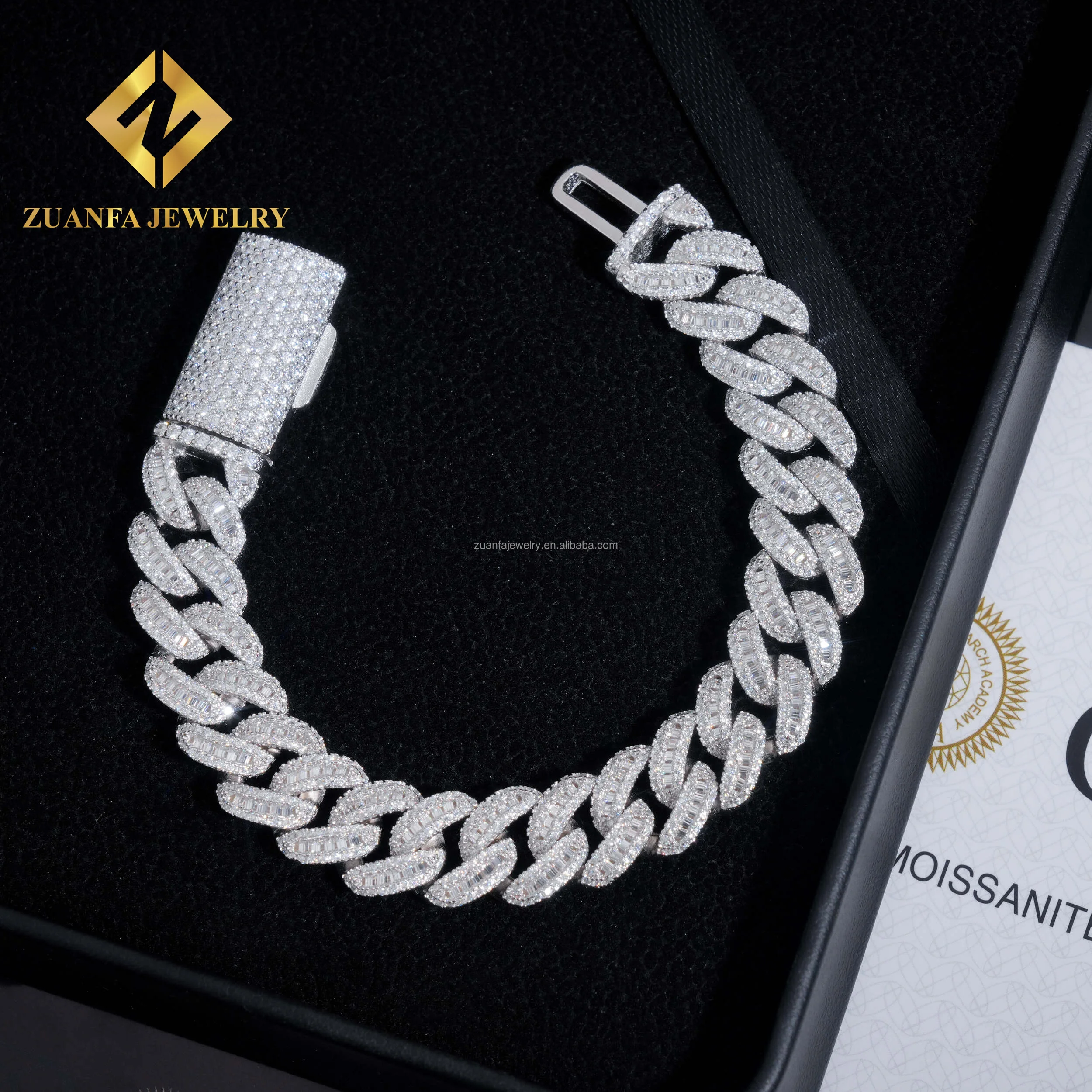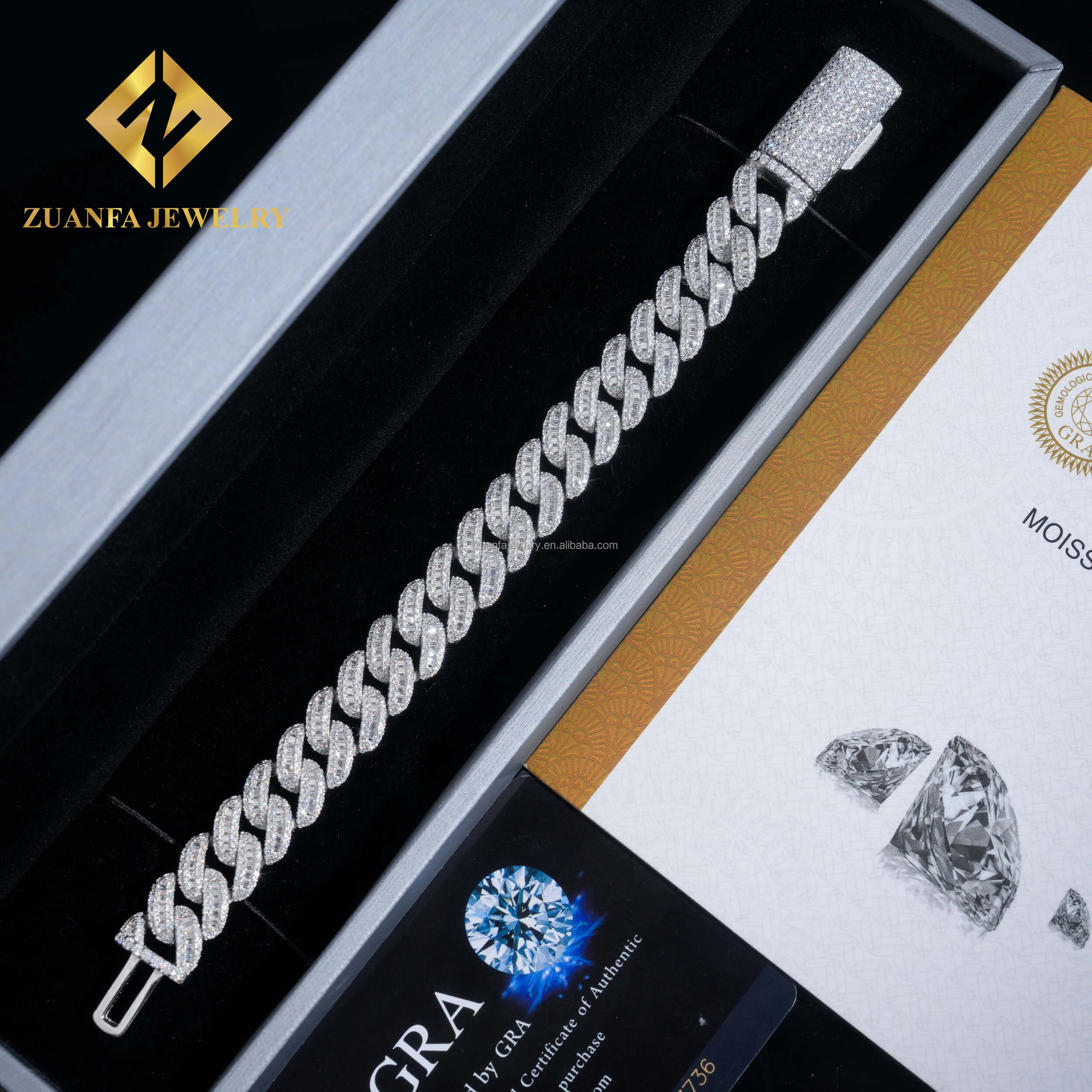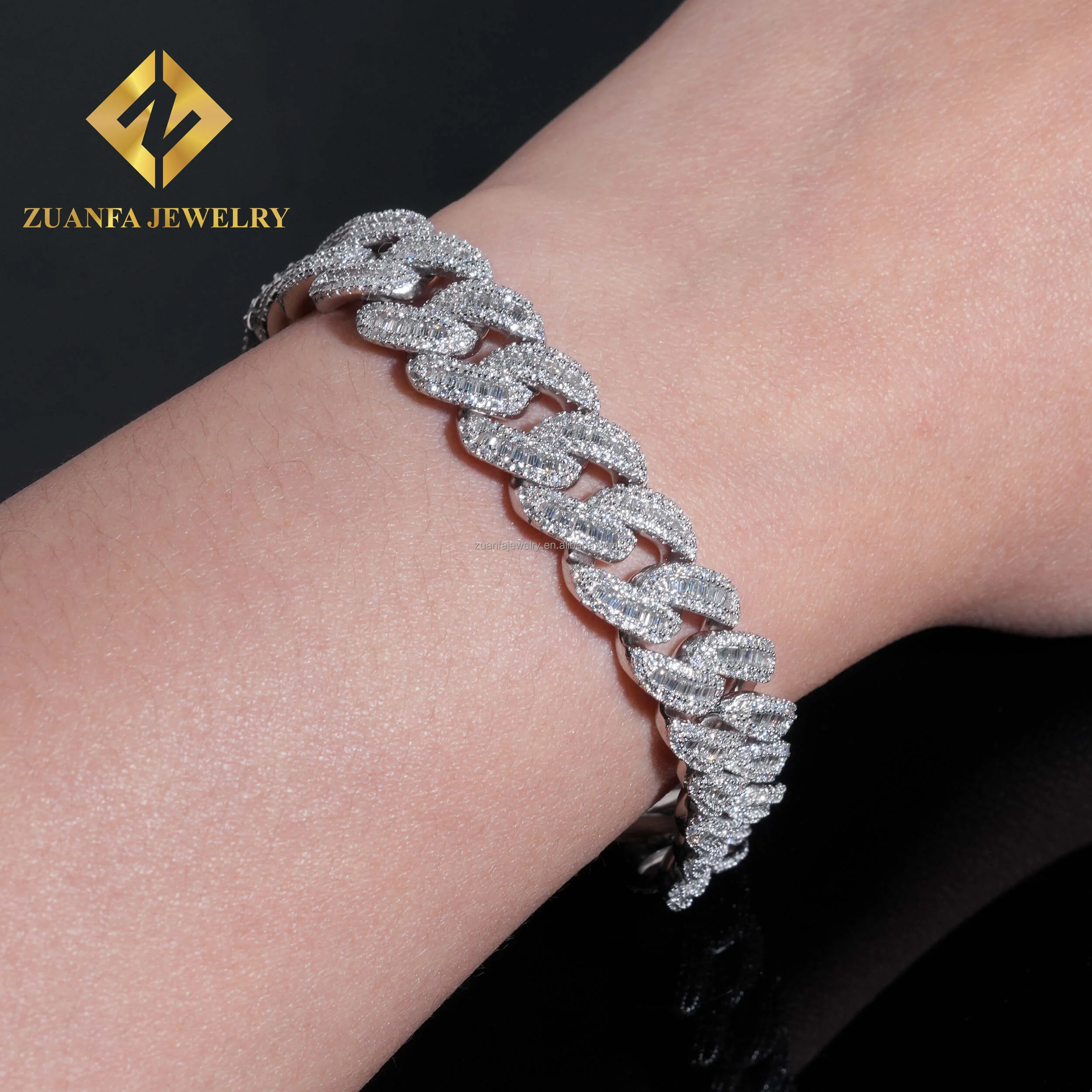 Product Name | Zuanfa New Style Iced Out Moissanite Bracelet Sterling Silver 925 Hip Hop 12MM VVS Baguette Moissanite Diamond Cuban Bracelet |